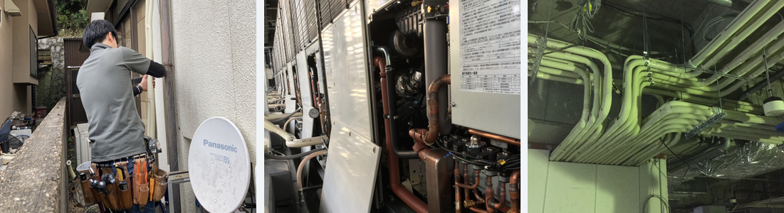 当方はこれまでに、数多くのご依頼をいただいてまいりました。エアコンの取付け・取り外しから、配管工事まで。とくに配管工事は、同業者様より好評をいただいております。これからも日々勉強に励み、施工と向き合っていきたいと考えております。